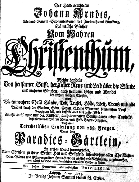 Il medico, teologo luterano e scrittore mistico tedesco Johann Arndt, nato nel 1555, viene comunemente considerato il padre teologico del pietismo tedesco: i suoi lavori ispirarono il fondatore del movimento, Philipp Jakob Spener.